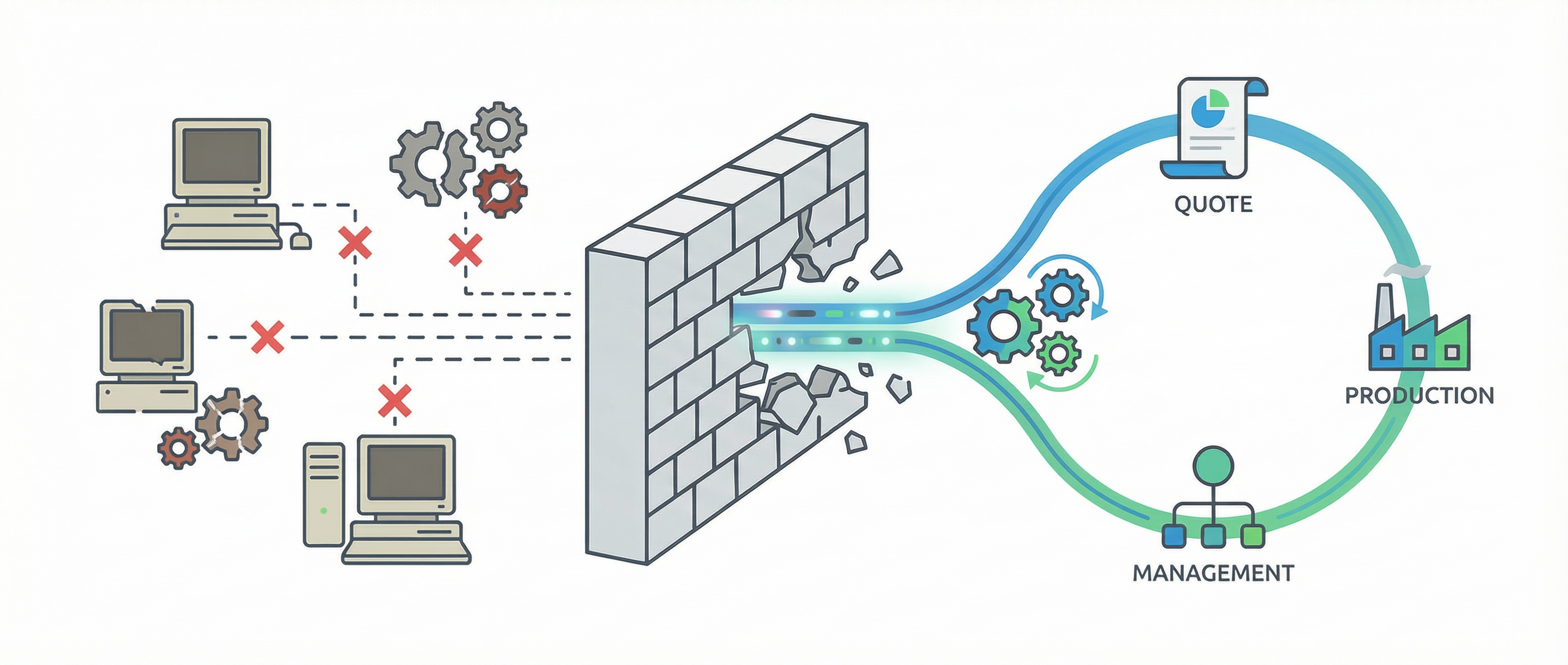 経済産業省が警鐘を鳴らす「2025年の崖」もFlowSyncならこうした環境でもデータをつなぎ直し、見積から生産・管理までの製造業特有のプロセスを一つの流れとして自動化します。さらに、これまで培ってきた現場の勘・経験・判断を活かしながら、DX × AIにより社内データを可視化・蓄積することで、経験にデータという裏付けを加えたデータドリブン経営を実現します。