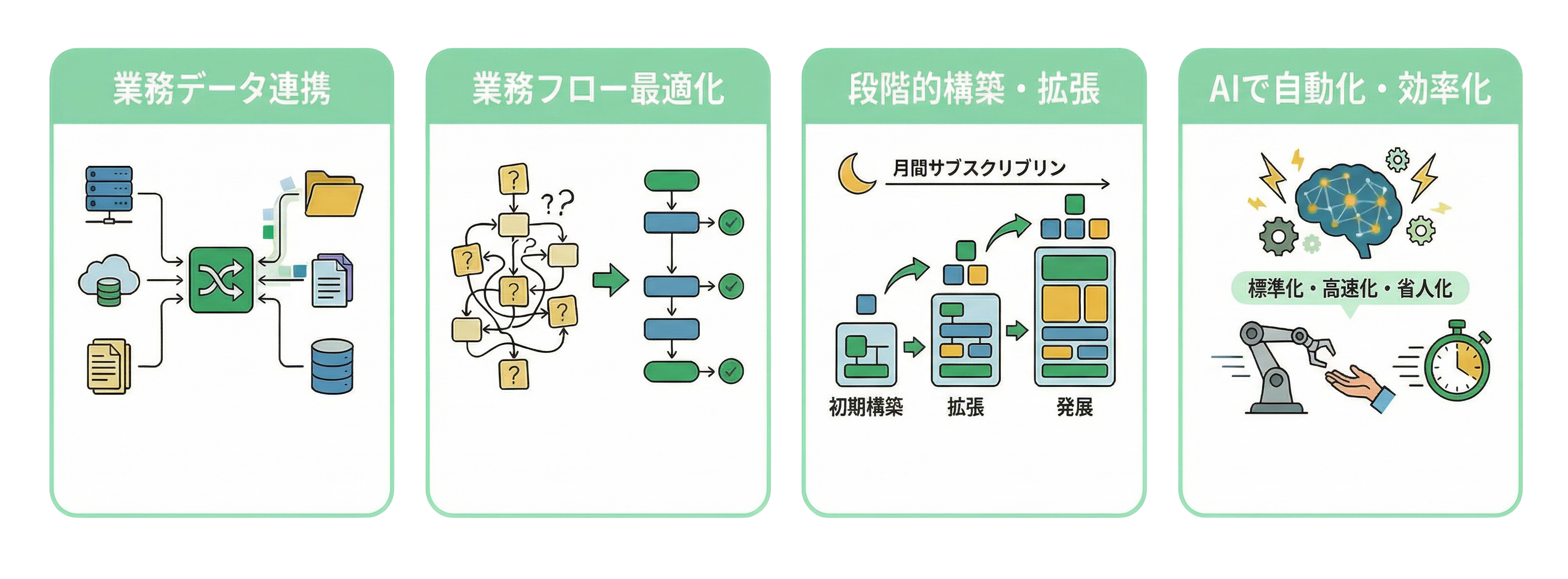 必要な機能を整理し、効果が出やすい順に導入計画を作成します。